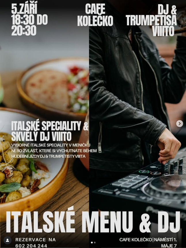 Přijďte si užít nezapomenutelný páteční večer, kde se snoubí skvělá hudba, italské speciality a pohodová atmosféra. DJ VIIITO, známý svým energickým setem, se postará o hudební zážitek, zatímco my vám naservírujeme menu z těch nejlepších surovin – s láskou k Itálii i dobrému jídlu.